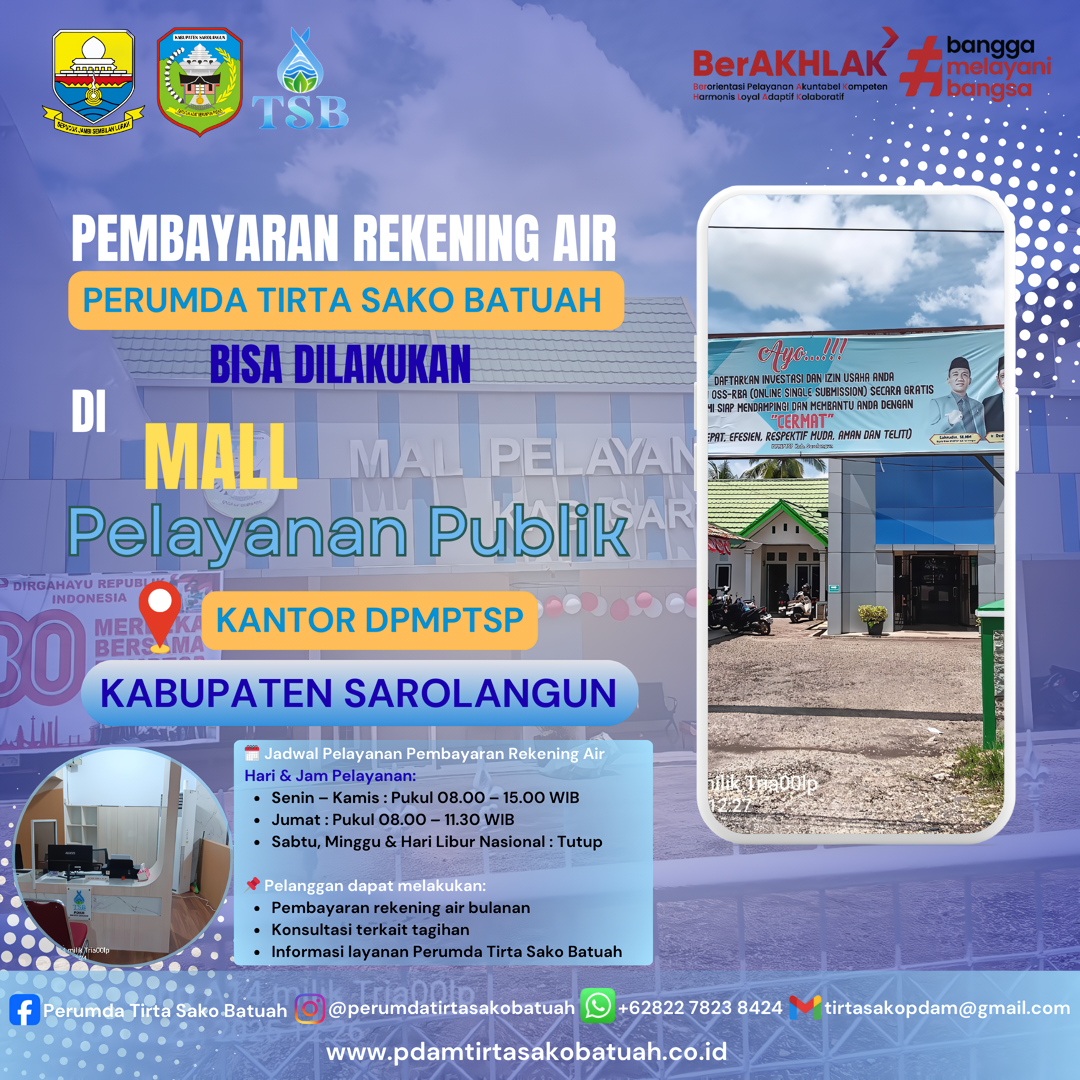 Demi memberikan kemudahan dan pelayanan terbaik bagi pelanggan tercinta, kini pembayaran rekening air Perumda Tirta Sako Batuah Kabupaten Sarolangun dapat dilakukan di Mall Pelayanan Publik (MPP) yang berlokasi di Kantor DPMPTSP Kabupaten Sarolangun. Mari bersama kita wujudkan pelayanan prima, dengan tetap membayar rekening air tepat waktu agar aliran air bersih tetap mengalir sampai ke rumah-rumah kita. Terima kasih atas kepercayaan dan kebersamaan Anda, karena setiap tetes air adalah amanah untuk kehidupan.